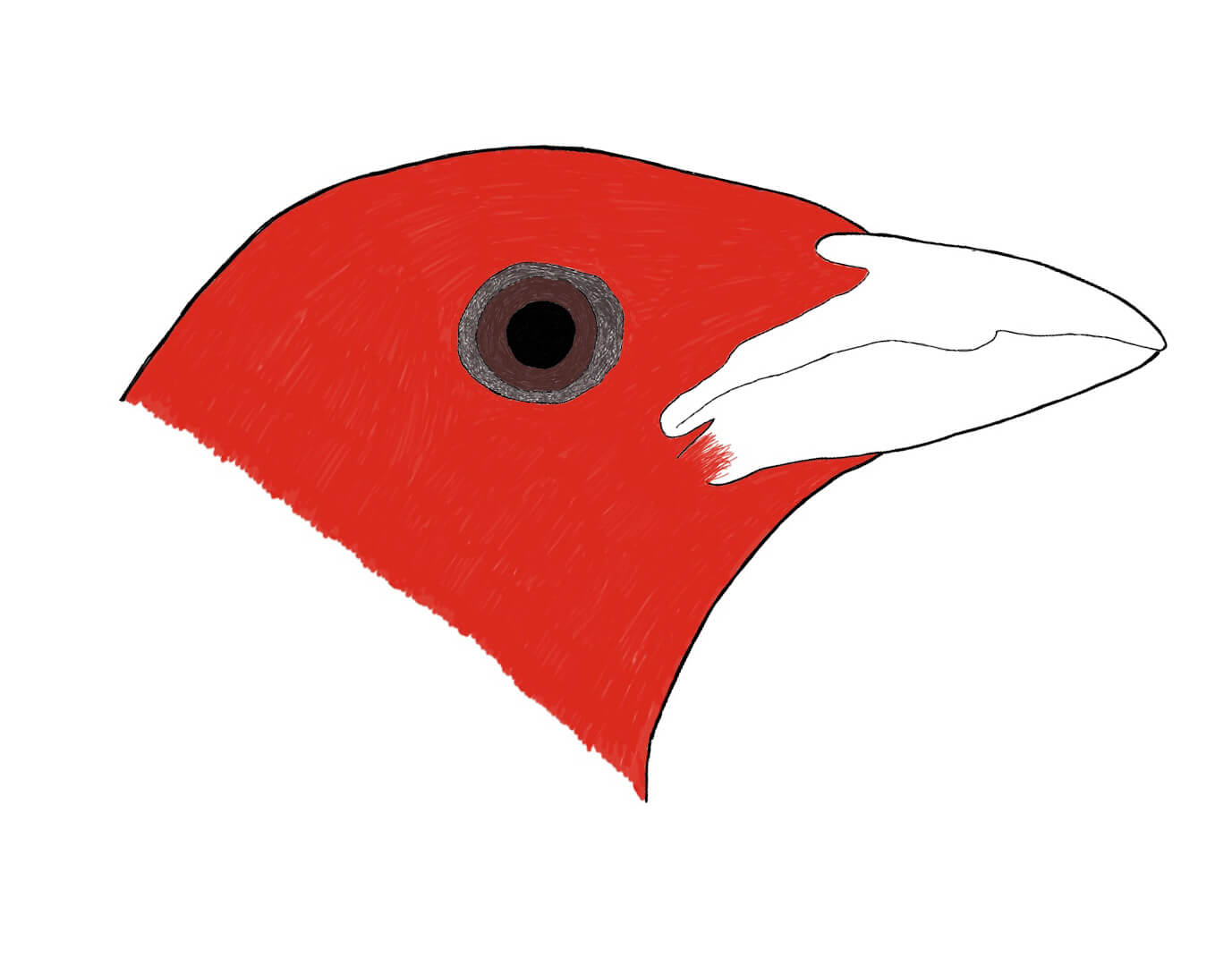 The Scarlet Tanager male has the same bright red body color as the male Cardinal, also lacking the black face and crest, but has solid black wings and a bill like that of the Summer Tanager shown above.